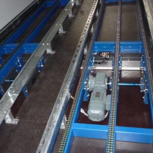 Querfahrwagen versetzen das Transportgut von einer zur nächsten Förderlinie. Hierbei wird auf ein spurgebundenes Transportsystem zurückgegriffen.